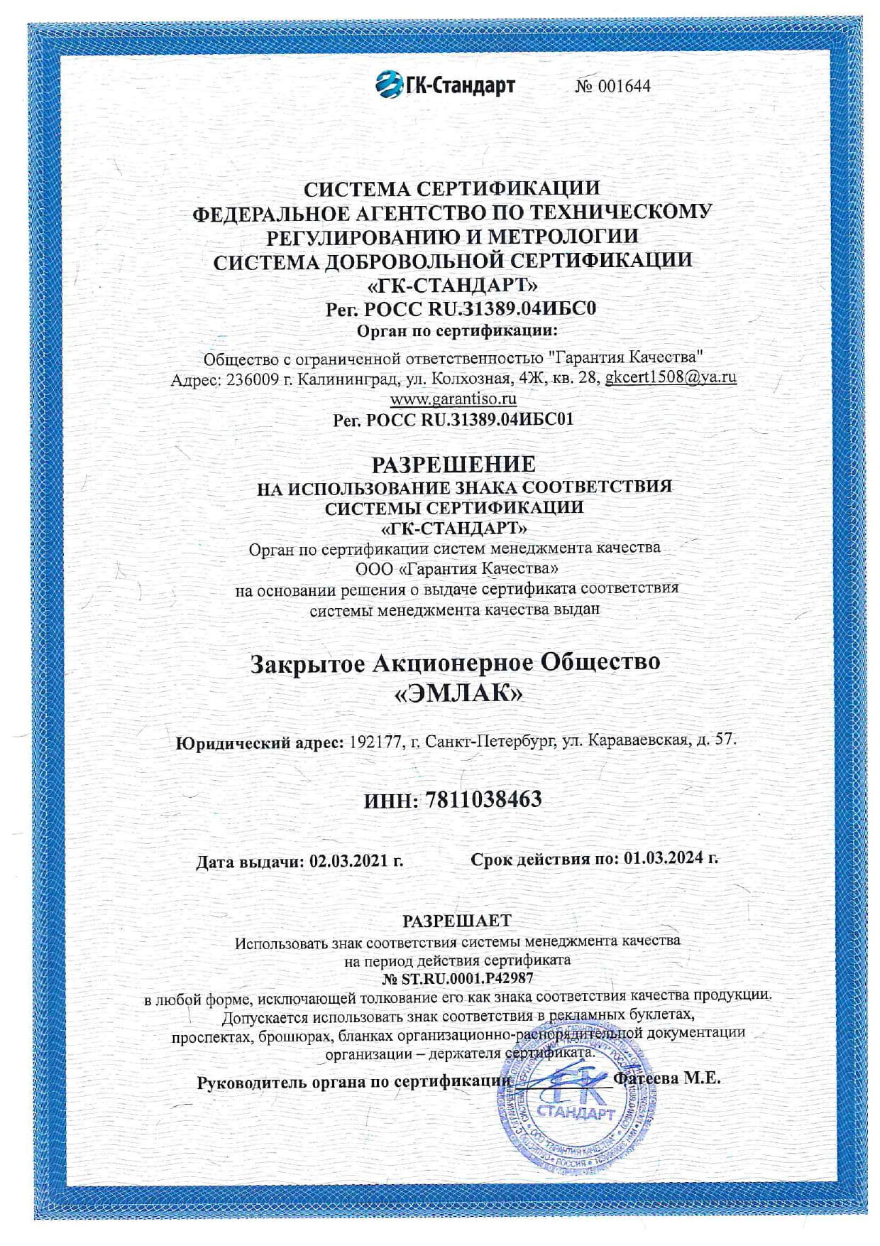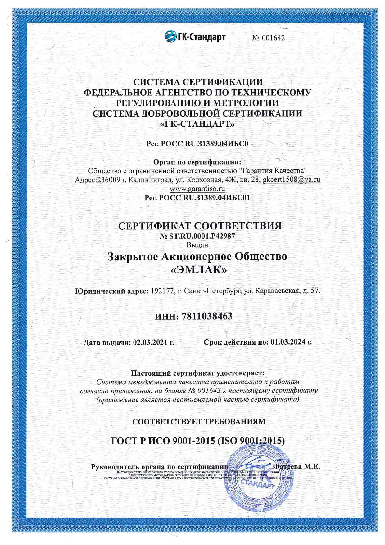 В феврале 2018 года ЗАО «ЭМЛАК» успешно прошел ресертификатию СМК, соответствующая требованиям ГОСТ Р ИСО 9001-2015 (ISO 9001:2015).