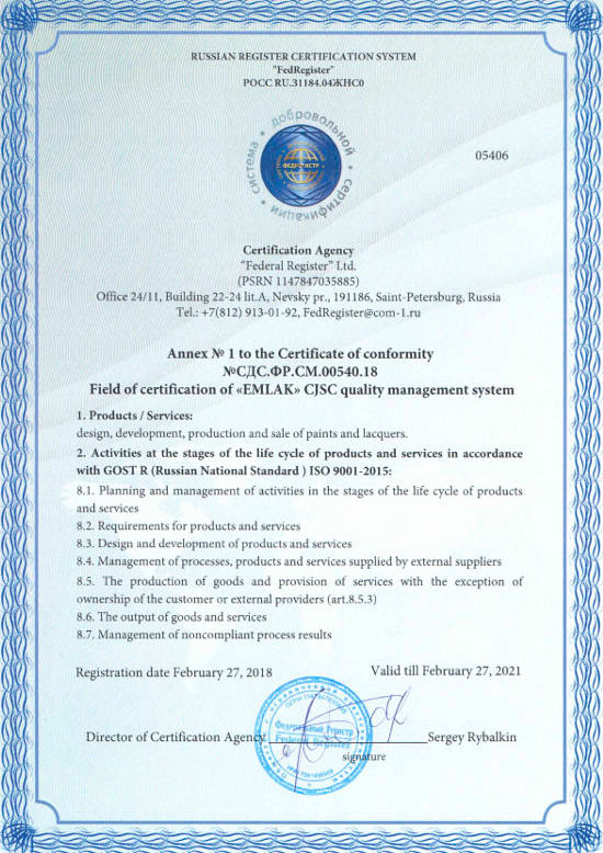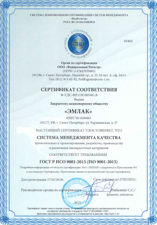 Двухкомпонентный лакокрасочный материал, состоящий из эпоксидной основы и отвердителя аминного типа. Эмаль наносится в качестве первого слоя в системах лакокрасочных покрытий для поверхностей металлических конструкций с остаточными плотнодержащимися продуктами коррозии. Рекомендуется к применению в системах покрытий для защиты от коррозии надводного и подводного борта судов неограниченного района плавания.